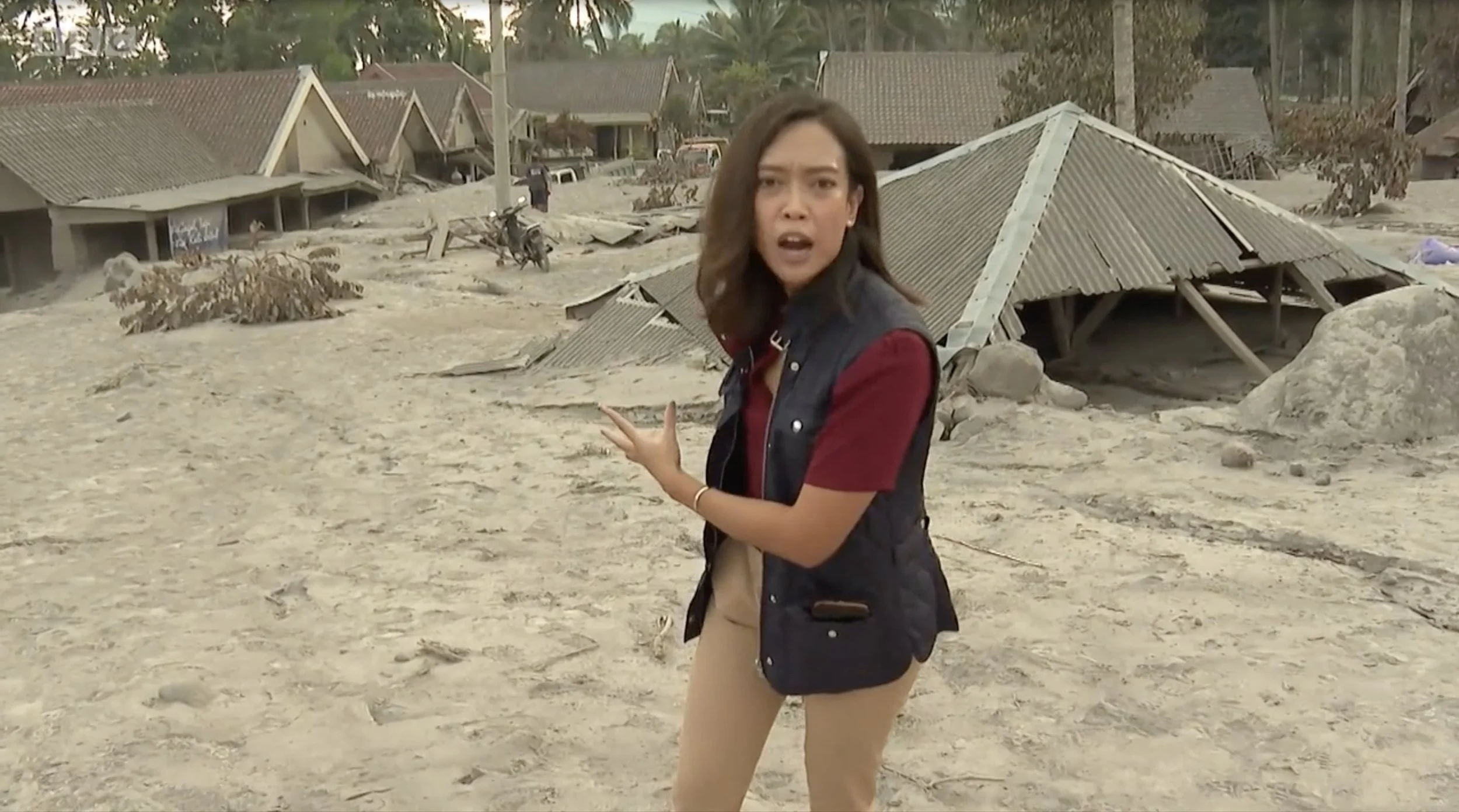 BBC Reporter Surrounded by Houses Buried by Ash; reporting on the ground from the eruption of Mount Semeru in Indonesia.